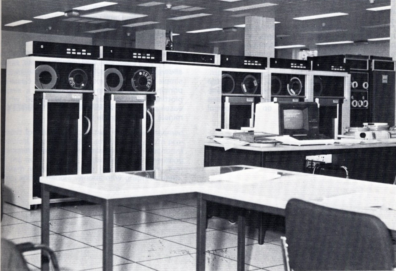 La seconde baie en partant de la droite est celle des DECtapes, la troisième est l'unité centrale avec un lecteur optique de bande perforée servant au boot. On ne voit ni les dérouleurs de bande magnétique ni les disques durs amovibles à plateaux.