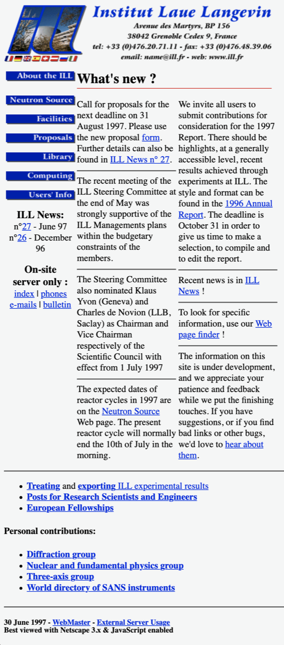 Le web n'a pas échappé à cette règle. Aucun service ne voulant prendre la décision de créer un site ILL, c’est Eddy Lelièvre-Berna, alors responsable de D3, qui s'en est chargé de son propre chef vers novembre 1996. Cela a eu pour effet de débloquer la situation car, en 1997, Herma Buttner demandera à un professionnel d'en modifier partiellement la présentation; son travail ne fit pas l’unanimité, au moins pour la première mouture. Le site subira quelques itérations puis sera entièrement repensé en 2007 avec migration du contenu (des milliers de pages) sous Typo3, un CMS (Content Management System) de conception allemande. En 2017 le site est scindé en deux avec un look nouveau pour <www.ill.eu> (2026) et le look ancien pour <wwwarchive.ill.fr> (2017).