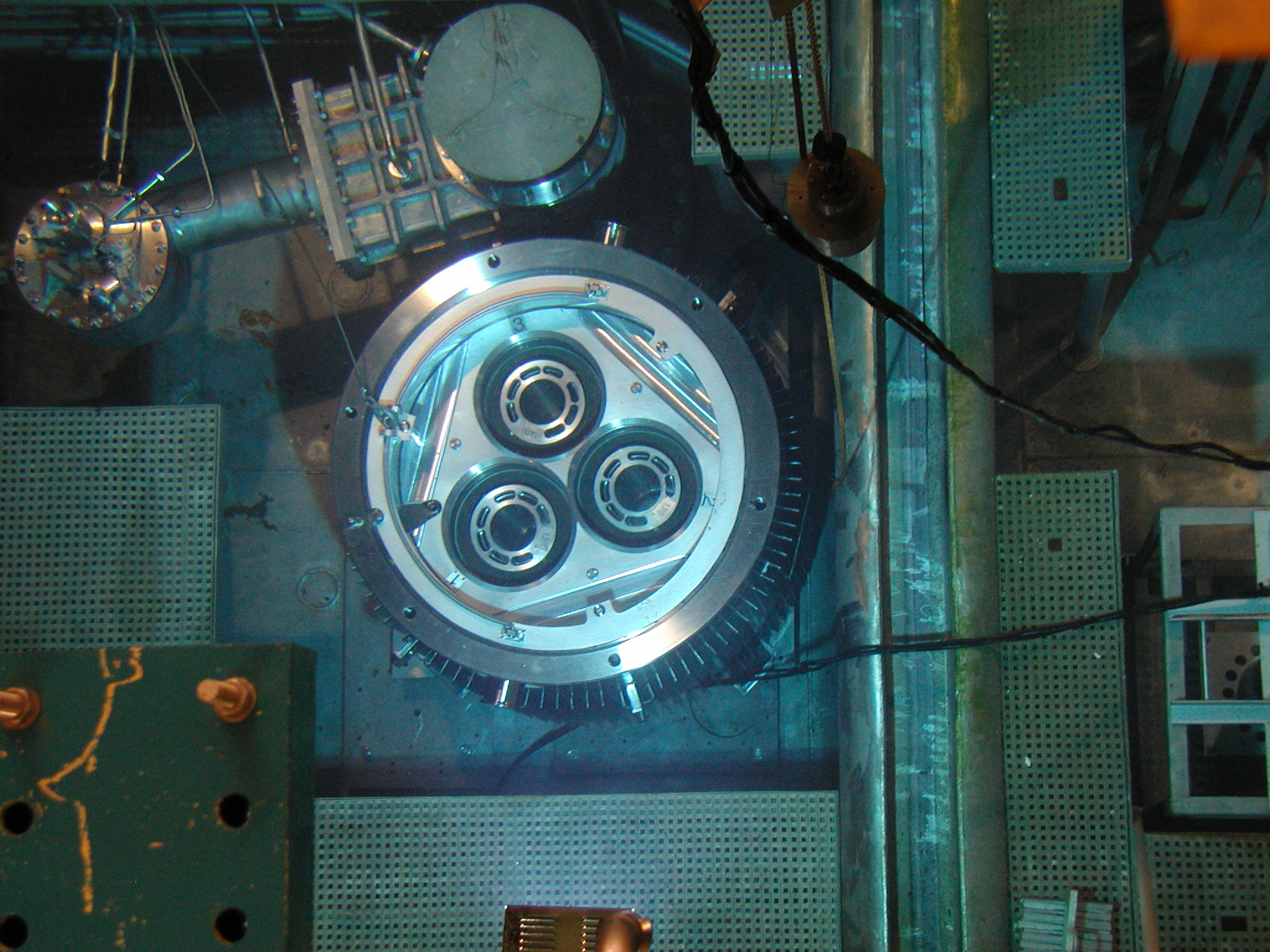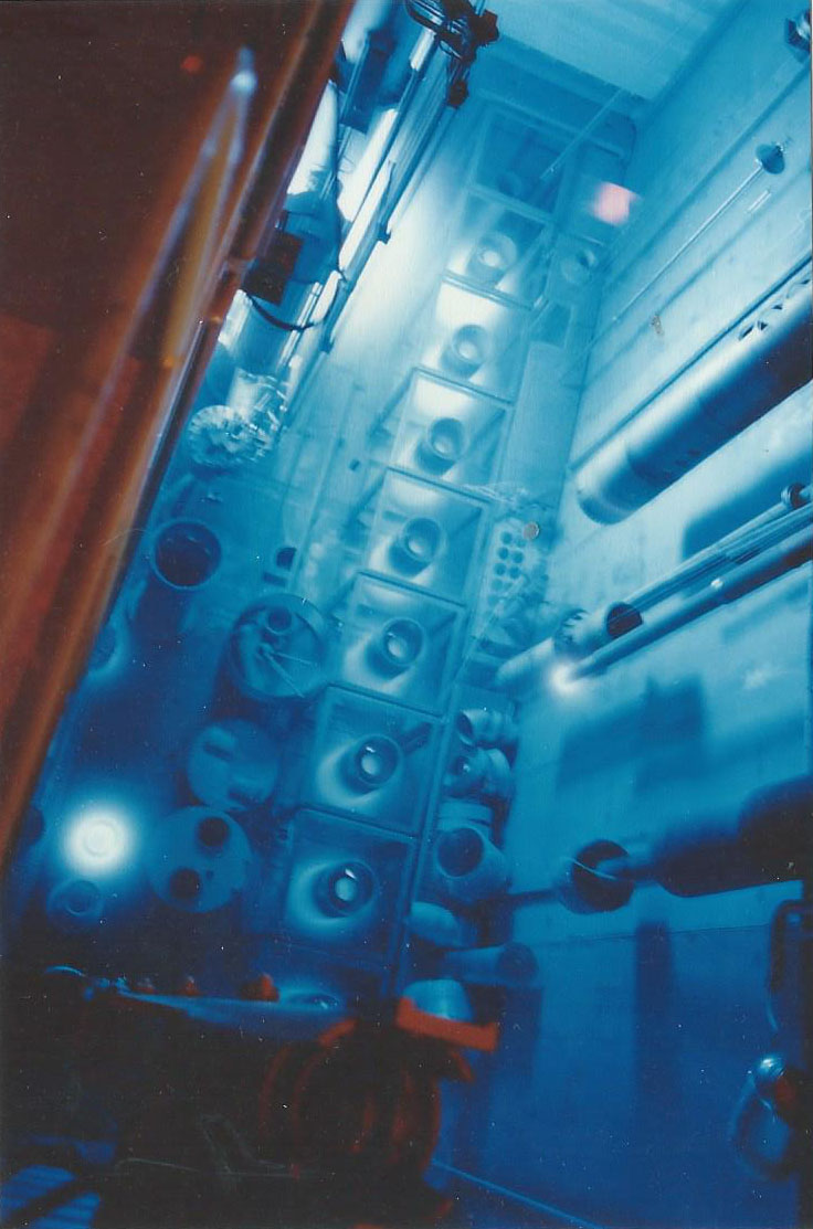Les photos montrent la canal de transfert éclairé par le seul rayonnement Cherenkov des éléments combustibles en cours de désactivation et d'autres pièces fortement activées. C'est beau, non ?