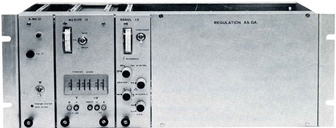 Pour la cryogénie, le rapport annuel de 1972 mentionne l'achat et la mise en fabrication de 3 régulations à diodes AsGa (1.5 T 300). Il s'agissait de régulations (familièrement appelées "régules CNRS") développées au CNRS/CRTBT par Jean-Louis Bret, Jean-Paul Faure et Gilles Pelletier en 1972 et commercialisées par la société MERIC [1]. Elles étaient basées sur de l'électronique analogique et dotées d'une thermométrie à diodes AsGa.