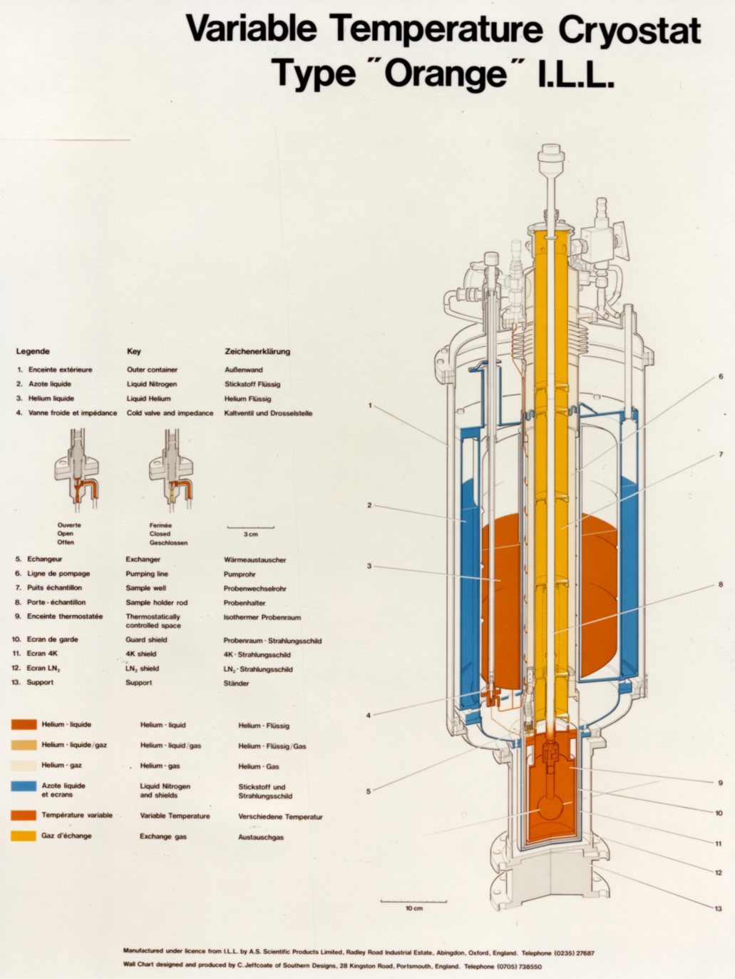 L'ILL a alors proposé son design à diverses entreprises et finalement choisi AS Scientific (Abingdon, UK) qui a construit les cryostats orange sous licence ILL non exclusive. Le deal initial était un cryostat gratuit pour l'ILL pour dix fabriqués, puis c'est devenu un pourcentage.