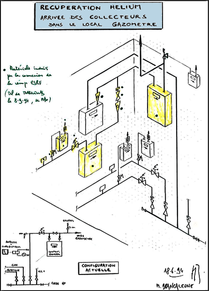 Venant d'un labo basse température "pauvre", Dominique Brochier a presque tout de suite entrepris la construction d'un système de récupération couvrant tout l'ILL. Ce dispositif a été mis en service en 1972 et a vite permis, bon an, mal an, de recycler près de 90% de l'hélium, une économie très substantielle pour l'ILL comme on le verra plus loin. Cet équipement devenu familier, tout le monde l'appelle maintenant affectueusement "la récup".
