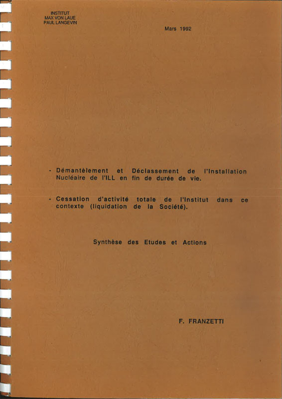 Ces chiffres sont à rapprocher de ceux de l'estimation du coût du démantèlement de l’INB, soit 115 M€ et 8 ans de travaux. En effet une étude complète du démantèlement, accompagné d'un plan social, fut menée à la demande de la direction de l’Institut Laue-Langevin (ILL) mais en dehors de la division réacteur. L’ingénieur responsable était Monsieur FRANZETTI, ancien directeur de la division du réacteur (DRE).