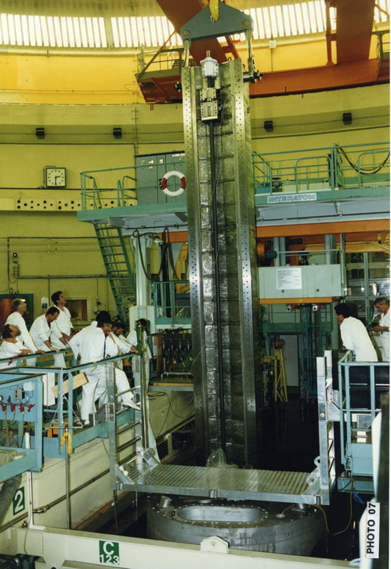 Pour apprécier la tenue à la fatigue des futurs appareils, l’ancien bloc pile immergé dans la piscine put servir de maquette à l’échelle 1 pour mesurer tous les coefficients d’amortissement avec masse d’eau entraînée. Pour cela le bloc pile destiné à la destruction fut excité localement et les modes propres de vibrations déterminés par mesure directe.