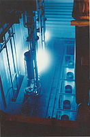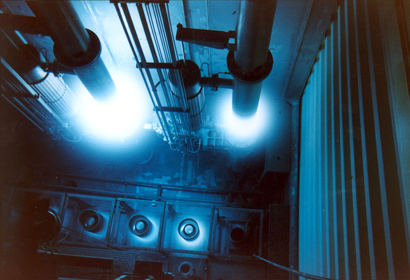 Les photos montrent la canal de transfert éclairé par le seul rayonnement Cherenkov des éléments combustibles en cours de désactivation et d'autres pièces fortement activées. C'est beau, non ?