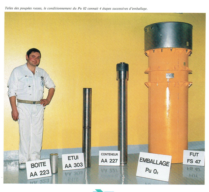 Notons au passage que cette amélioration constante dans le fonctionnement de l’usine entraîna une refonte profonde de la partie atelier de purification de l’uranium et également de la partie purification du plutonium, jusqu’au conditionnement et entreposage de ce dernier. (Voir ci-après une photo concernant les emballages de l’oxyde de plutonium sous forme de « poupées russes ».)