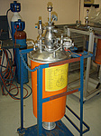 - 1987: Serge Pujol a développé de nombreuses compétences en cryogénie grâce au cryostat orange. Il construit alors un cryostat pour berceau d'Euler, très compact et à circulation d'hélium. Les performances sont "bleuffantes" (1,8 K à 450 K) mais la consommation d'hélium est élevée (1 litre par heure).
