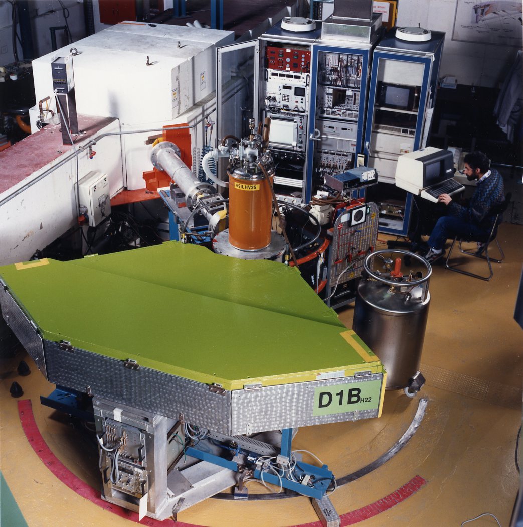 Cryostats CT14 de Cryogenics Associates (de couleur bleue). Ils venaient des USA et étaient très utilisés à Brookhaven au début des années 70. L'échantillon était monté dans une boîte scellée fixée sur le réservoir d'hélium liquide. Pour changer l'échantillon il fallait donc vidanger l'hélium liquide, vidanger l'azote liquide, réchauffer le tout, ouvrir la boîte scellée, puis faire l'opération inverse, ce qui prenait 6 heures au moins. C'était acceptable pour les réacteurs de faible puissance où les expériences durent des semaines ou des mois, mais pas pour l'ILL. C'est encore plus vrai maintenant car le rythme s'est accéléré, les instruments de l'ILL ayant gagné en moyenne un facteur 25 en efficacité.