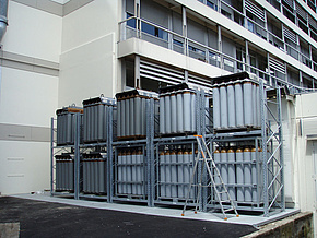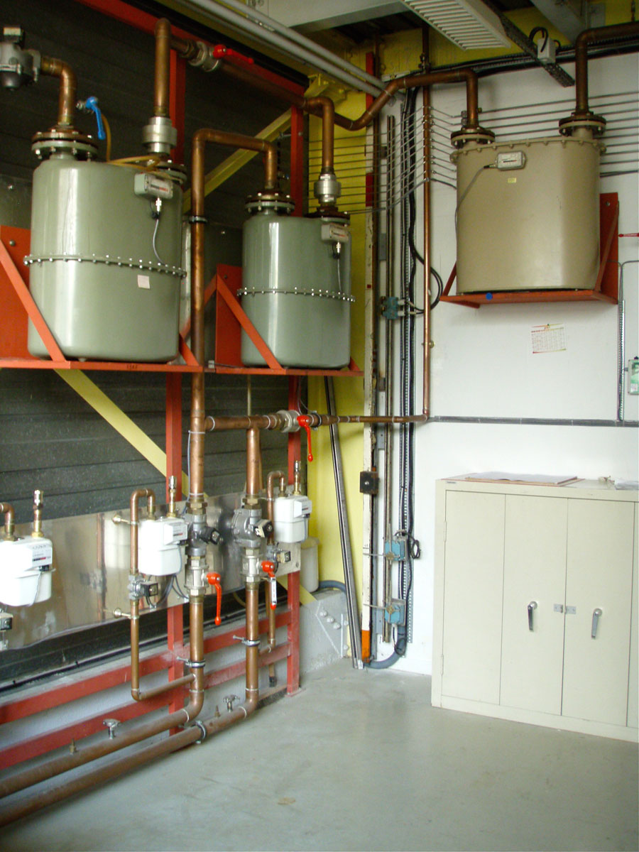 Quand l’IBS s’est installé sur le campus EPN, il a été intéressé à récupérer l’He vaporisé dans les gros cryo-aimants de ses spectromètres RMN car, si leur consommation est peu élevée, les transferts d’He génèrent beaucoup de pertes. En octobre 2013, une ligne de 430 m a donc été raccordée entre l’IBS et l’ILL (tube Inox Ø80 intérieur). Les débits d’He variant énormément (faibles en période de mesures RMN, forts en période de remplissage des cryo-aimants RMN), des compteurs bas et haut débits ont été installés en parallèle, qui se partagent automatiquement les mesures des volumes récupérés.