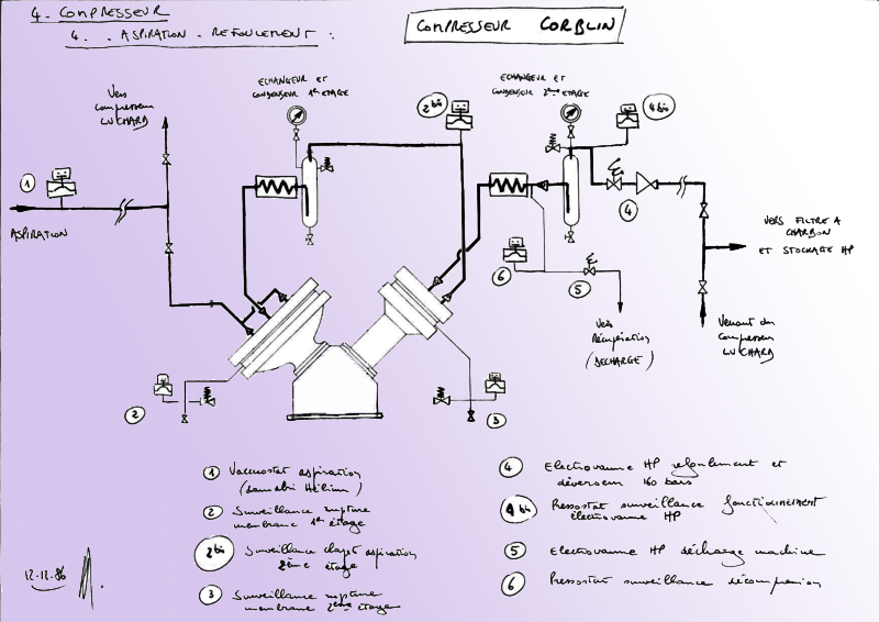 Dès le départ, le dispositif comportait un système de compression du gaz pour permettre son transport au CENG. Selon Dominique Brochier, c'est lui-même qui a calculé les compresseurs mais c'est Gabriel Prati qui a fait le reste car il connaissait bien les problèmes de perte de charge. Les tuyaux sont en cuivre. Pourquoi ? Brochier a hésité entre plastique et cuivre mais un ami plombier lui a dit "Mets du cuivre !" alors il a mis du cuivre.