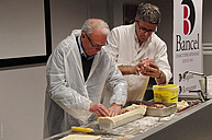 Le matin nous avons pris le car pour Mours-Saint-Eusèbe où nous avons visité l'entreprise familiale Bancel qui réalise des charcuteries traditionnelles de la Drôme depuis 1964. Après une présentation audiovisuelle très réussie, le chef de l'entreprise, Laurent Bancel a démontré la préparation d'un pâté drômois, assisté de Georges Le Lan. Malheureusement, le produit a dû être détruit au lieu de cuit - mais pas à cause de Georges - c'était la régulation hygiénique qui l'imposait.